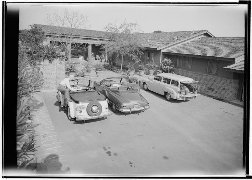 Images of a house's landscaping. Includes the front exterior of the house, fencing, a gate, and flower beds.