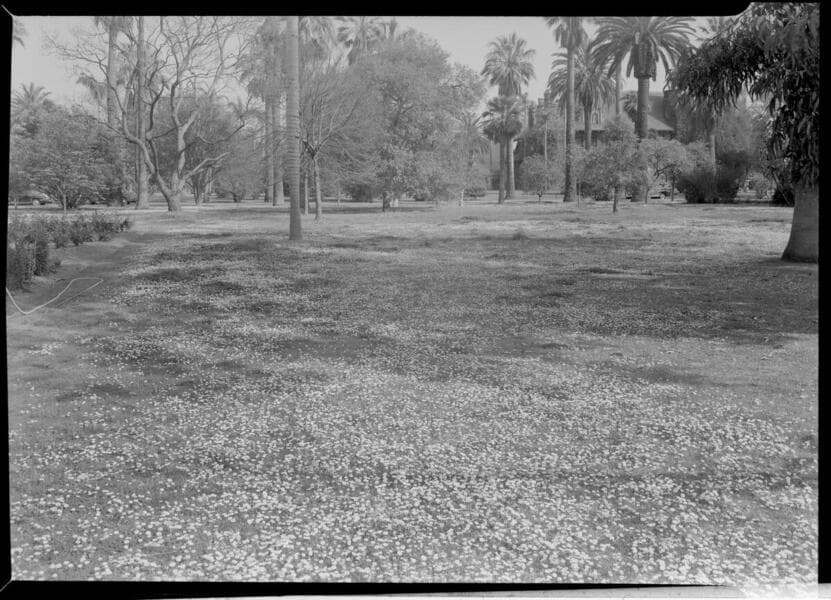 Views of houses and lawns, and daisies.