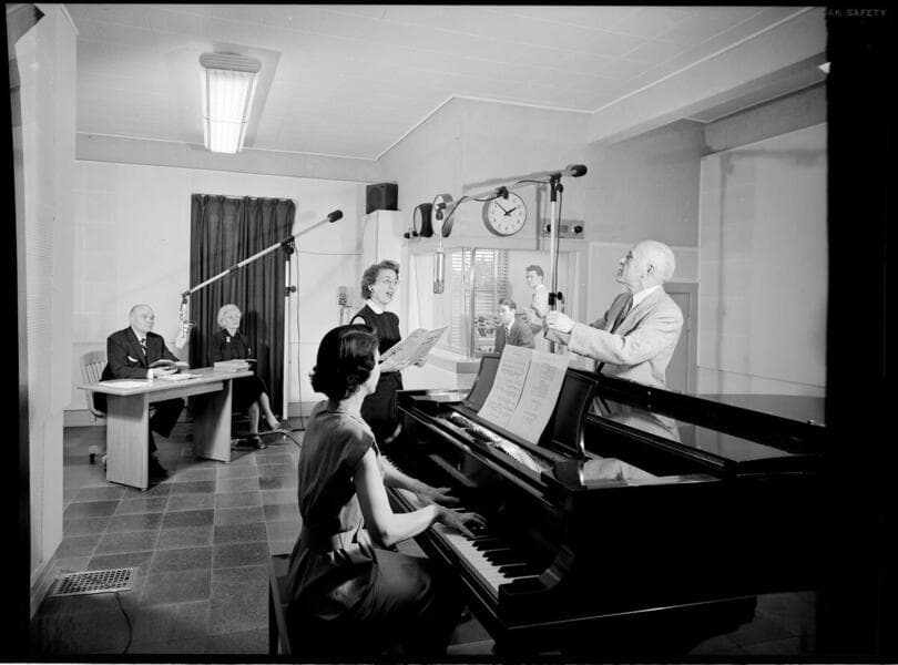 Group photographs of students, photographs of offices, Herbert Armstrong, Loma Armstrong, and radio broadcasts.