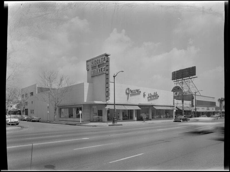 Exterior and interior views of the store on Wilshire Boulevard. Includes details of the porte cochere, views of merchandise display fxtures, some furniture, and many views of equipment (HVAC?) in the basement.