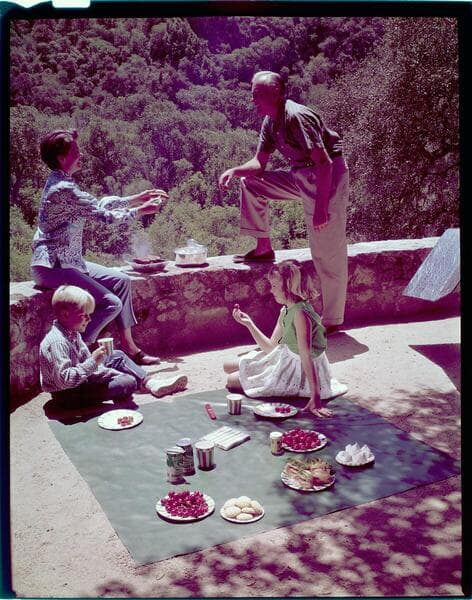 Views of miscellaneous food servings, some with table settings. Images include picnic food, fish, hors d'oeuvres and fruit pie.