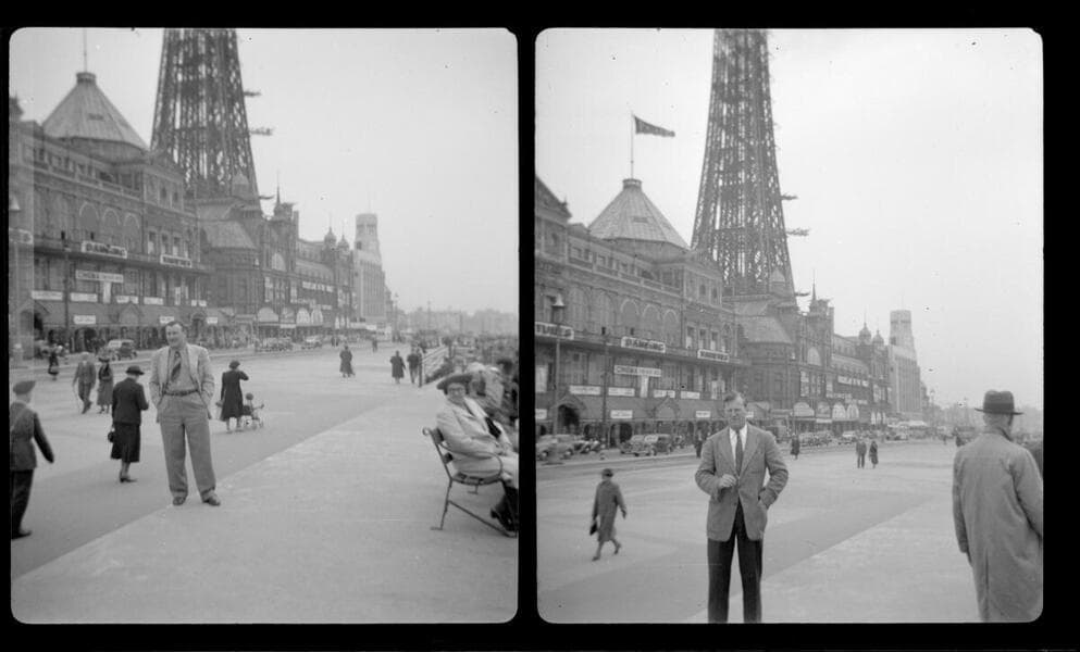 Views of landscapes in Canada and Mexico; Shasta Dam; fields of flowers; Stockmen's Hotel sign; portraits of unidentified individuals; a hotel swimming pool and a lodge-type hotel; views of the yellow Jeepster; farm equipment and an airplane; cows; architectural details; a sculpture of Babe the Blue Ox; and numerous unidentified buildings.