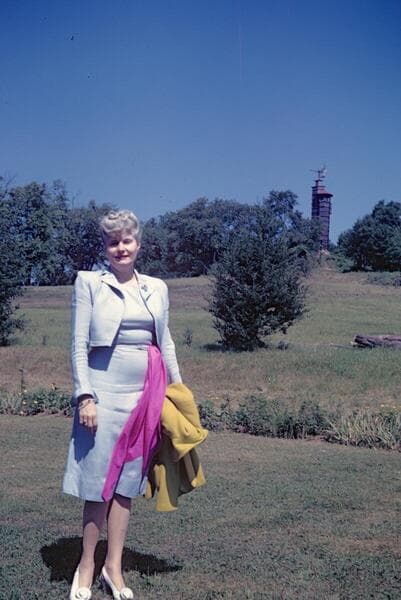 Various shots of Elizabeth Gordon and others, taken during trips for assignments for House Beautiful. Includes several views on a ferry deck, which also include Frances Heard and Monte Hammer.