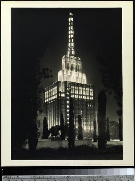 L1.1 - Lighting, misc. - View at night of downtown Los Angeles, Central Library, and Richfield Building from Engstrum Hotel Apartments.
