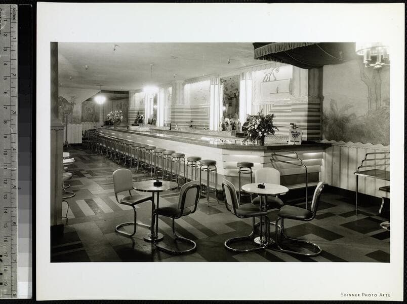 Exterior and interior views of various businesses. Includes I. Magnin, Desmond's, John Frederics, Rose Ann Sitkin, May Company, Klump Building, Lawsons Jewelry, Paul Hesse Studios, Bekins storage facility, Reingold Jewelry, Joy Yuen Low restaurant (also includes interiors), an unidentified bar (interior), and a row of storefronts that includes the George Hurrell photography studio.