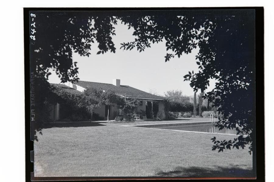 Exterior and interior views of house, featuring pool and guest house or pool house.