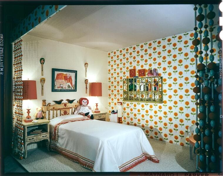 Views of wallpaper setups in the bedroom and pool area sitting room.