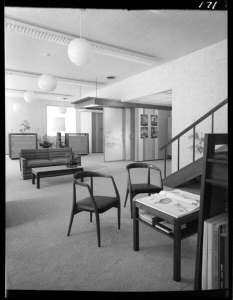 Views of Harrell's interior design showroom? Also includes a portrait (of Harrell?).