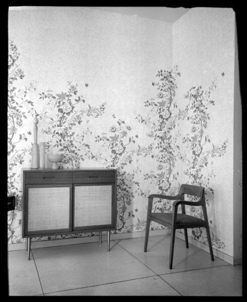 Views of wallpaper setups. Also includes portraits of Remy Chatain in his office, decorated with Stockwell's Martinique wallpaper.