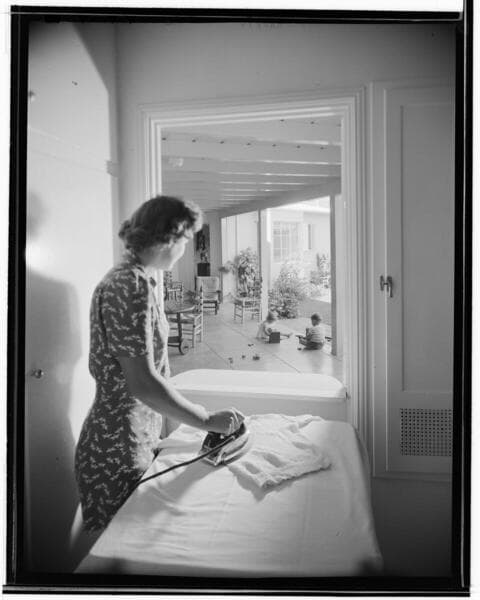 House interiors and exteriors. Images include one of an unidentified woman in patio and children playing in the living room.