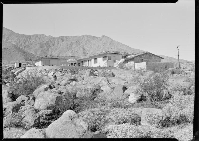 Interiors and exteriors of a house in desert landscape. Large format negatives were shot in 1938 and some published in February 1939. Four images are smaller format negatives that include Elizabeth Gordon and unidentified persons around the pool; these were likely taken in 1940.