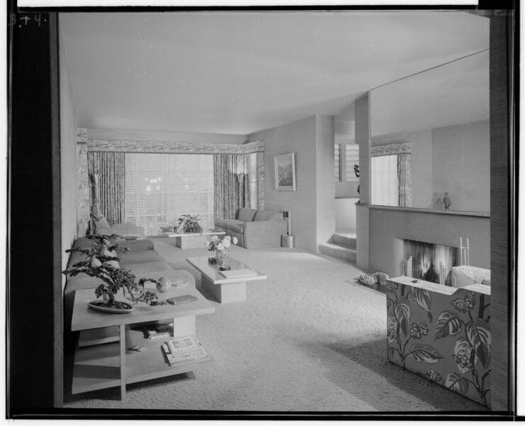 Exterior and interior views of house with Asian–influenced landscaping and interior decoration. Photographs emphasize the garden.