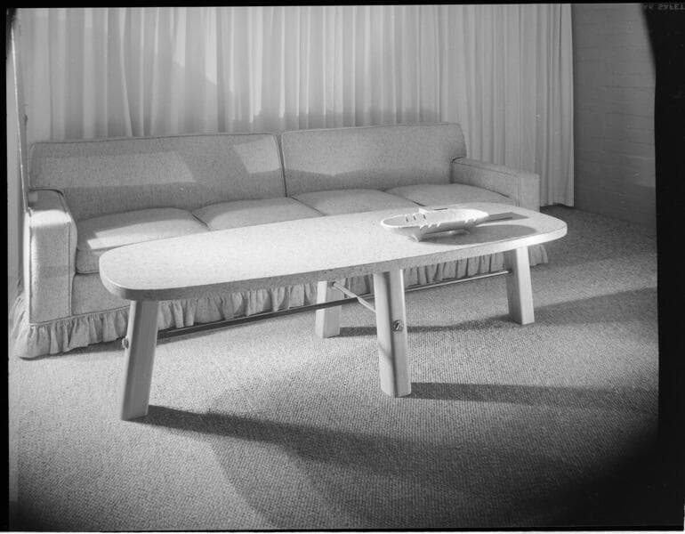 Images of furniture manufactured by Brown-Saltman in varying configurations apparently set up to be photographed in Carolyn Murray's own home. Includes images of a furniture base that can become a chair, table, or ottoman.
