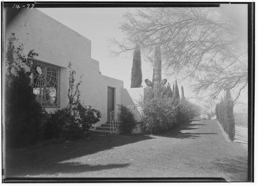 Interiors and exteriors of two-story residence set in a desert landscape [Arizona?]; views of extensive garden; views of long arched veranda; living room features a desert landscape mural painted on the wall.