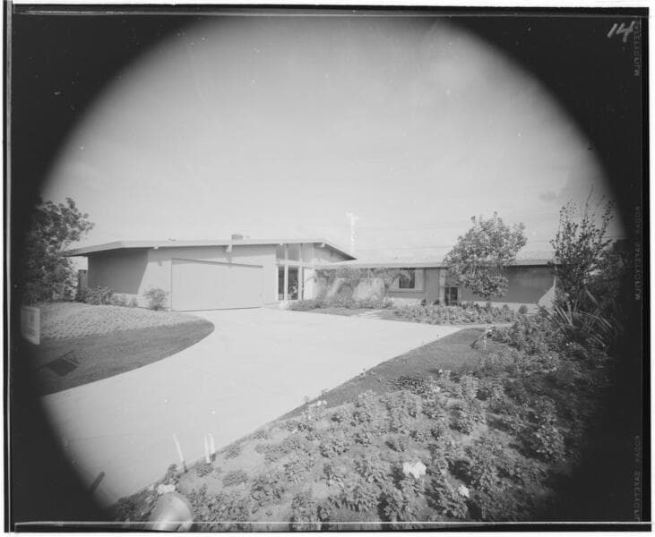 Interiors and exteriors of model home in the Rossmoor development located near Long Beach. Two images of the kitchen originally housed in inner sleeve marked "Frig" [Frigidaire?]. Furnished by Davis Furniture of Long Beach.