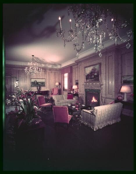 Exterior view, and interior views of bar, dining room, and lounges, including the Rose Room.