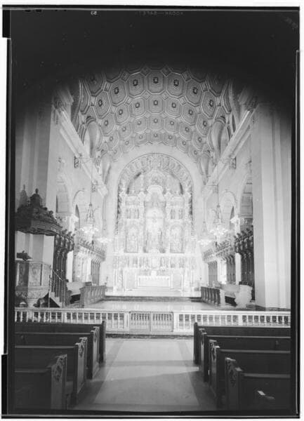 Architectural drawing of an ornate Presbyterian church building with a tall, narrow tower with steeple, and round stained glass windows in Pasadena, California.