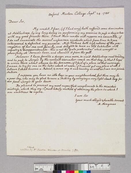 Merton College, Oxford, England, (1 p.). Signed: "A. Nonymus."