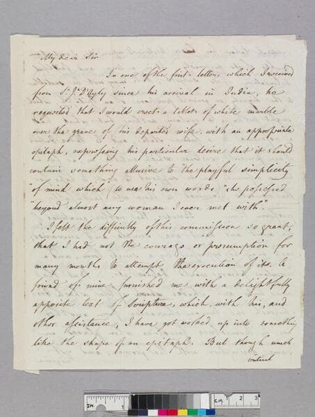 Red wax seal; cover sheet repaired, (4 p.). Also enclosed: Hastings' draft of an epitaph for Lady D'Oyly (4 p.). Subject: Lady Diana Rochfort D'Oyly, d. 1803, Sir John Hadley D'Oyly, 1754-1818.