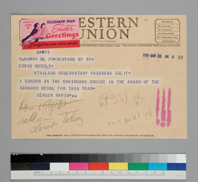 Davis Bergen wires EPH that he agrees on the chairman's choice for the Barnard Medal award