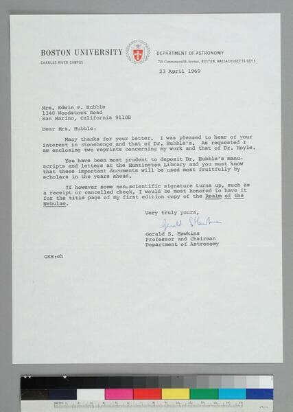 Astronomer Gerald Hawkins of Boston University writes to Grace Hubble
