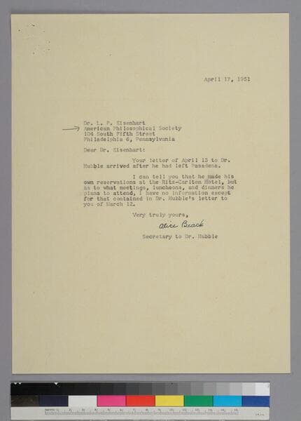 Secretary Alice Beach writes on behalf of EPH to L. P. Eisenhart of the American Philosophical Society