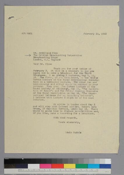 EPH writes to Archibald Clow of the British Broadcasting Corporation