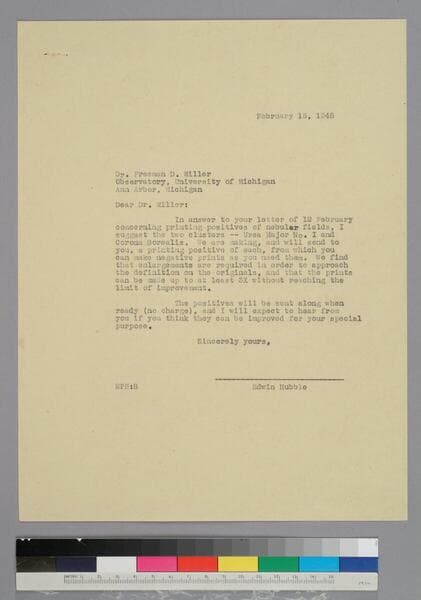 EPH writes to astronomer Freeman Miller of the University of Michigan