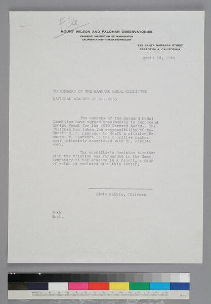 EPH writes to the Barnard Medal Committee of the National Academy of Sciences