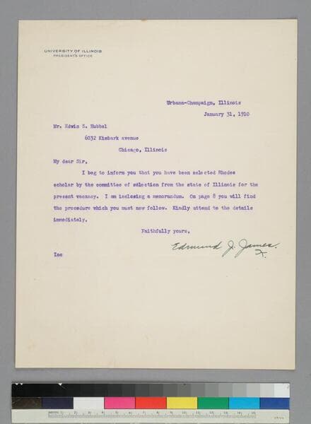 Edmund James, president of the University of Illinois and chair of the Rhodes Scholarship Committee, writes EPH