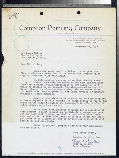 The collection contains 10,454 semi-cataloged items andis housed in 72 boxes and 3 oversize folders. The collection documents Loren Miller's four decades of fighting for equality and civil rights and his legal work against racial real estate covenants and discrimination in housing. It contains material related to his work with several organizations including the NAACP, National Urban League and the ACLU. The collection also contains material related to Loren Miller's personal life and family as well as his journalism career and ownership of the California eagle. The collection also contains many items related to Langston Hughes including letters written between Miller and Hughes and copies of some of Hughes' writings. The collection contains the following types of material: correspondence, telegrams, postcards, manuscripts, speeches, newspaper and magazine clippings, publications including full magazines, briefs and other legal documents, brochures, meeting minutes, reports and photographs as well as research notes for and drafts of Miller's book The petitioners: The story of the Supreme Court of the United States and the Negro.