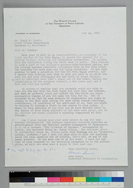 Assistant professor of mathematics, Anne Lewis, of the Woman's College, the University of North Carolina, writes to EPH