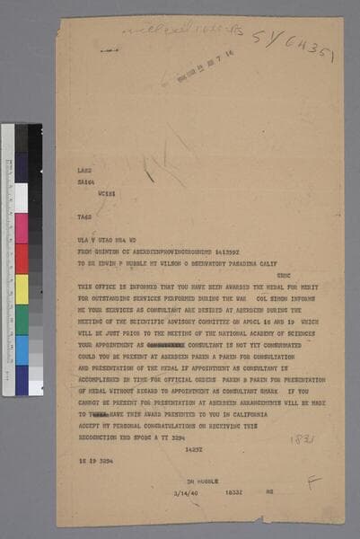 Plane and missile, not long after missile was released. Stamped with perforations "confidential." Note in the hand of Grace Burke Hubble: "EPH Huntington Library"