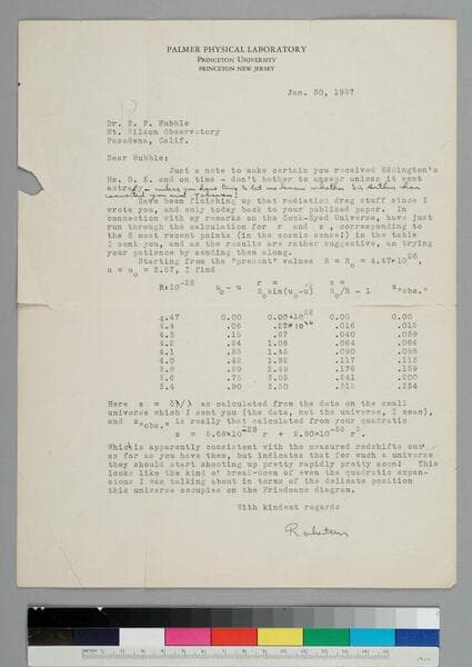 Physicist Howard Robertson of Princeton University writes to EPH