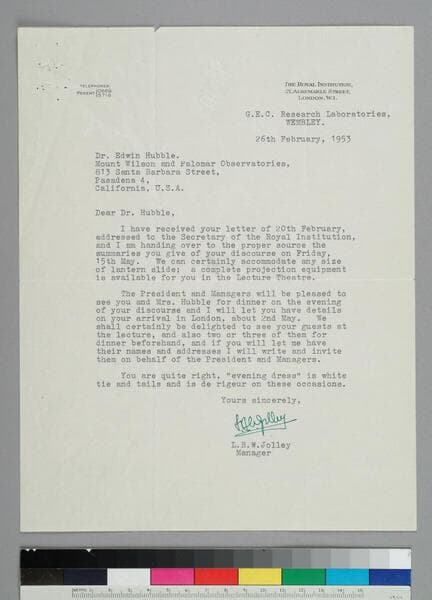 L. B. W. Jolley, Manager of the Royal Institution, writes to EPH