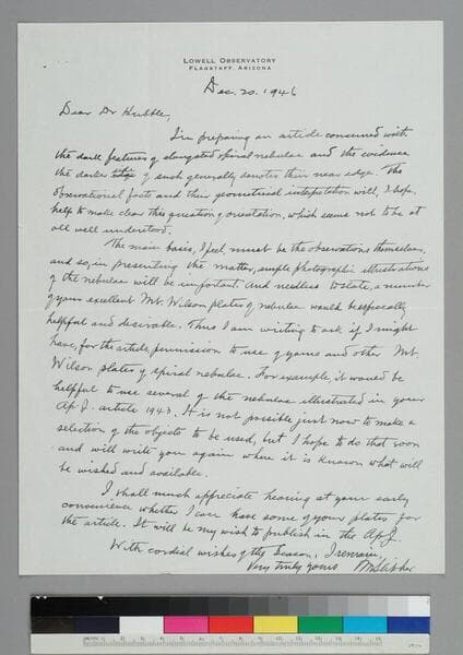 Astronomer Vesto Slipher, of the Lowell Observatory, writes to EPH asking permission to print images from Mt. Wilson of spiral nebulae