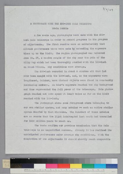 A short essay by EPH, probably a press release, describes the success of the 200-inch Hale Telescope