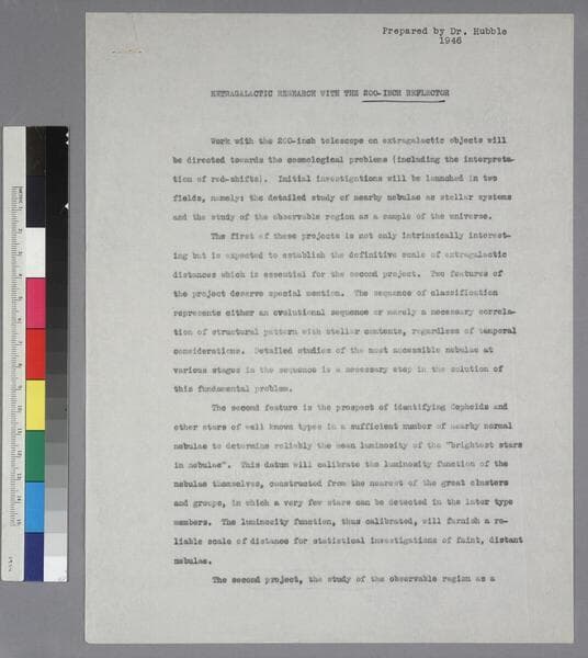 The papers of Edwin P. Hubble include manuscripts and reprints of his articles, papers, public lectures, addresses, etc., scientific documentation for his papers, logbooks of photographic plates taken by Hubble at Mount Wilson and Palomar Observatories, diaries and biographical memoirs of his wife Grace Burke Hubble, professional, personal, and social correspondence, photographs, medals and awards, a scrapbook assembled by Grace Hubble, newspaper clippings, etc.