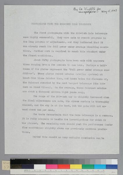 A short essay by EPH, probably a press release, describes the first photographs from the new Hale 200-inch telescope