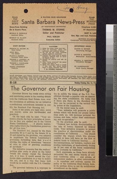 The collection contains 10,454 semi-cataloged items andis housed in 72 boxes and 3 oversize folders. The collection documents Loren Miller's four decades of fighting for equality and civil rights and his legal work against racial real estate covenants and discrimination in housing. It contains material related to his work with several organizations including the NAACP, National Urban League and the ACLU. The collection also contains material related to Loren Miller's personal life and family as well as his journalism career and ownership of the California eagle. The collection also contains many items related to Langston Hughes including letters written between Miller and Hughes and copies of some of Hughes' writings. The collection contains the following types of material: correspondence, telegrams, postcards, manuscripts, speeches, newspaper and magazine clippings, publications including full magazines, briefs and other legal documents, brochures, meeting minutes, reports and photographs as well as research notes for and drafts of Miller's book The petitioners: The story of the Supreme Court of the United States and the Negro.