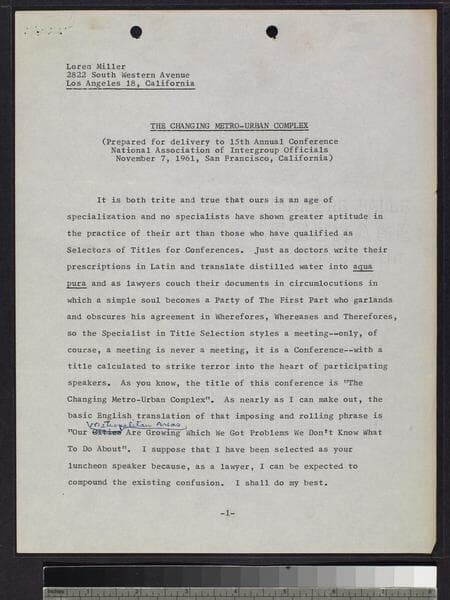 The collection contains 10,454 semi-cataloged items andis housed in 72 boxes and 3 oversize folders. The collection documents Loren Miller's four decades of fighting for equality and civil rights and his legal work against racial real estate covenants and discrimination in housing. It contains material related to his work with several organizations including the NAACP, National Urban League and the ACLU. The collection also contains material related to Loren Miller's personal life and family as well as his journalism career and ownership of the California eagle. The collection also contains many items related to Langston Hughes including letters written between Miller and Hughes and copies of some of Hughes' writings. The collection contains the following types of material: correspondence, telegrams, postcards, manuscripts, speeches, newspaper and magazine clippings, publications including full magazines, briefs and other legal documents, brochures, meeting minutes, reports and photographs as well as research notes for and drafts of Miller's book The petitioners: The story of the Supreme Court of the United States and the Negro.