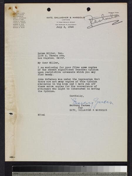 The collection contains 10,454 semi-cataloged items andis housed in 72 boxes and 3 oversize folders. The collection documents Loren Miller's four decades of fighting for equality and civil rights and his legal work against racial real estate covenants and discrimination in housing. It contains material related to his work with several organizations including the NAACP, National Urban League and the ACLU. The collection also contains material related to Loren Miller's personal life and family as well as his journalism career and ownership of the California eagle. The collection also contains many items related to Langston Hughes including letters written between Miller and Hughes and copies of some of Hughes' writings. The collection contains the following types of material: correspondence, telegrams, postcards, manuscripts, speeches, newspaper and magazine clippings, publications including full magazines, briefs and other legal documents, brochures, meeting minutes, reports and photographs as well as research notes for and drafts of Miller's book The petitioners: The story of the Supreme Court of the United States and the Negro.