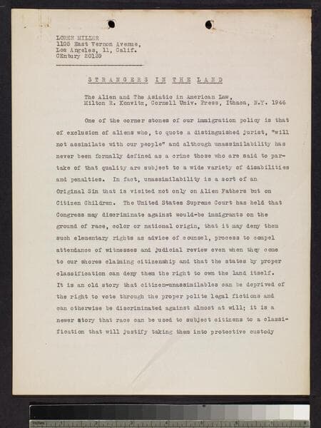 ["Strangers In the Land: A Note on the Development of Racial Ghettos in California"] [c.1933]. 3 items