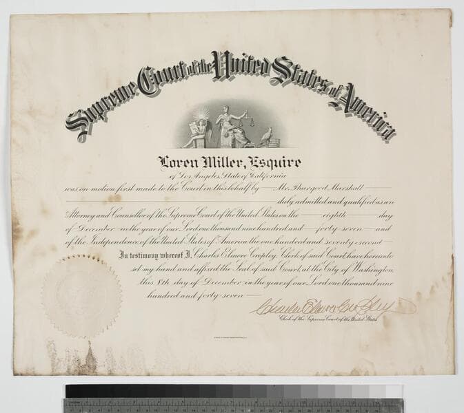 [Certificate "Supreme Court of the State of California" admission to state Supreme Court for Loren Miller], 26 x 36 cm. (1934, June 7). 1 item