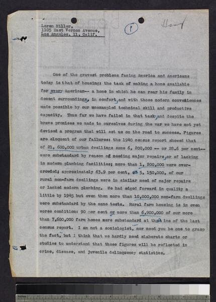 Untitled speech by Loren Miller beginning "One of the gravest problems"