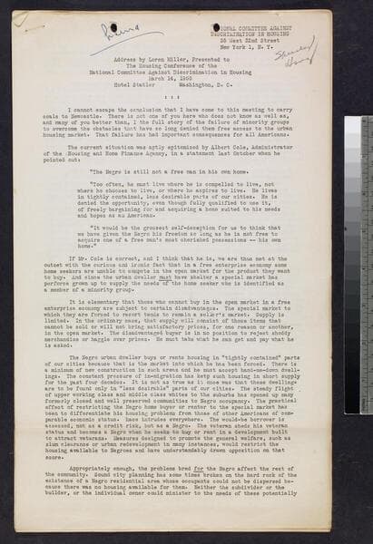 General Note This collection consists of the personal and professional papers of journalist, civil rights activist, attorney and judge Loren Miller (1903-1967). The collection focuses on events taking place in Los Angeles and all of California; New York City and Harlem; Chicago and Detroit, chiefly between the 1930s and 1960s. The collection contains 10,454 semi-cataloged items and is housed in 72 boxes and 3 oversize folders. The collection contains the following types of material: correspondence, telegrams, postcards, manuscripts, speeches, newspaper and magazine clippings, publications including full magazines, research notes, briefs and other legal documents, brochures, meeting minutes, reports and photographs. The following people and organizations are participants in the collection: Sadie Tanner Alexander, American Bar Association, American Federation of Labor, Charlotta Bass, Fletcher Bowron, Tom Bradley, Edmund "Pat" Brown, California Eagle, California Municipal Court (LA County), California Supreme Court, Civil Rights Congress, Nathaniel Colley, Congress of Industrial Organizations, Congress of Racial Equality, Benjamin Davis, Lester Granger, Augustus F. Hawkins, Langston Hughes, Japanese American Citizens' League, John F. Kennedy, Robert F. Kennedy, League of Struggle for Negro Rights, Los Angeles Bar Association, Los Angeles Police Department, Los Angeles Urban League, Thurgood Marshall, Meschrabpom Film Company, Henry Lee Moon, Stanley Mosk, NAACP and its Legal Defense and Education Fund, National Bar Association, National Committee Against Discrimination in Housing, National Conference of Christians and Jews, National Lawyers Guild, National Urban League, Joel E. Spingarn and the following federal entities: United States Commission on Civil Rights, Fair Employment Practices Committee, Federal Housing Administration, Housing and Home Finance Agency, National Housing Agency, and the Supreme Court as well as Robert C. Weaver, Walter White, Roy Wilkins, Franklin Williams and Whitney Young. Subjects in the collection include: Africa, African Americans and other minorities in the United States; African American newspapers; civil rights and civil rights workers; communists and communism both in America and Russia; crime and race; discrimination in many areas including criminal justice administration, employment, housing, law enforcement and public accommodations; gangs; hate crimes; hate speech; inner cities; miscengenation; police brutality and misconduct; poverty; abuse of prisoners; race riots including Chicago, Detroit, Zoot Suit and Watts; racial profiling; slavery and reconstruction and African Americans in American history; real covenants; the Scottsboro case; social work; urban renewal; the United States Civil Rights Acts of 1957 and 1964, the Voting Rights Act of 1965, the 14th Amendment to the US Constitution; James Baldwin; Sammy Davis; Frederick Douglass; Lena Horne, Martin Luther King, Jr.; Jackie Robinson; Thomas J. Mooney; Malcolm X; and African American authors Countee Cullen, James Weldon Johnson, Claude McKay, George Schuyler and Jean Toomer. CorrespondenceThe correspondence series, which contains 4,607 items, is mainly made up of correspondence written by and to Loren Miller, both business and personal. It includes letters, telegrams, cards, and postcards (most of the letters by Loren are typed copies that he retained in his office). The series is arranged alphabetically by folder title and then chronologically. Most of the correspondence is business in nature and the folders will also contain manuscripts and documents that accompanied the original correspondence. There is one full box of letters and telegrams to Loren congratulating him on his judicial appointment in 1964, including letters by Johnnie Cochran and Judge Joseph Wapner, and two full boxes of sympathy letters, telegrams and cards to Juanita Miller after Loren's death in 1967 including one by Frank Mankiewicz (press assistant to Robert F. Kennedy). Personal PapersThe personal papers series, which contains 562 items, is made up of material related to Loren Miller's personal life and the Miller, Ellsworth and Gee families. It contains photographs, correspondence, documents, family trees, financial papers, and certificates. The series is arranged alphabetically by folder title and then chronologically. The photographs include family photographs and pictures of Loren Miller as a child. Some of the photographs are of Loren Miller's funeral and contain pictures of Tom Bradley and Evelle J. Younger at the funeral. Other people in the photographs are: Lena Horne, Lorne Green and DeFrantz Williams. There are also three full boxes of material related to Loren Miller, Jr. including notes from his law classes at Loyola Law School and several papers by students in a law class he taught. Professional PapersThe professional papers series, which contains 4,213 items, is made up of material related to Loren Miller's professional life including legal work (discrimination cases), civil rights work and his own writing. The series is arranged alphabetically by folder title and then chronologically. It contains correspondence, manuscripts, legal documents, briefs, notes, articles, essays, drafts of manuscripts, brochures, meeting minutes, reports, photographs, over 200 speeches, 100 of which are by Loren, and material for Loren's book The Petitioners as well as drafts of and his research and notes for the book. The series also includes material related to Loren's work with the various organizations with which he was affiliated (NAACP, ACLU, Urban League, etc.). There are five full boxes of folders labeled "NAACP" and one box of folders labeled "Urban League." The series also contains some items written by and related to Juanita Miller and her social work in Los Angeles as well as material related to the California Eagle. Publications, Magazines and Newspaper ClippingsThe publications, magazines and newspaper clippings ser