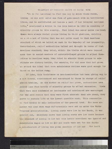 ["Treatment of Racial Groups in Social Work" by Juanita Miller] [undated]. 2 items. Items in this folder had live mold on them when the library acquisitioned them. They have since been cleaned and the mold is dead. In Mold Box 12