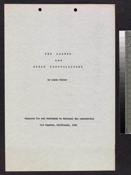The collection contains 10,454 semi-cataloged items andis housed in 72 boxes and 3 oversize folders. The collection documents Loren Miller's four decades of fighting for equality and civil rights and his legal work against racial real estate covenants and discrimination in housing. It contains material related to his work with several organizations including the NAACP, National Urban League and the ACLU. The collection also contains material related to Loren Miller's personal life and family as well as his journalism career and ownership of the California eagle. The collection also contains many items related to Langston Hughes including letters written between Miller and Hughes and copies of some of Hughes' writings. The collection contains the following types of material: correspondence, telegrams, postcards, manuscripts, speeches, newspaper and magazine clippings, publications including full magazines, briefs and other legal documents, brochures, meeting minutes, reports and photographs as well as research notes for and drafts of Miller's book The petitioners: The story of the Supreme Court of the United States and the Negro.