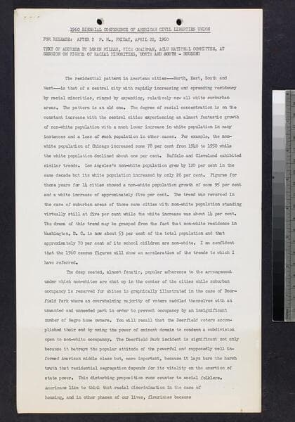 General Note This collection consists of the personal and professional papers of journalist, civil rights activist, attorney and judge Loren Miller (1903-1967). The collection focuses on events taking place in Los Angeles and all of California; New York City and Harlem; Chicago and Detroit, chiefly between the 1930s and 1960s. The collection contains 10,454 semi-cataloged items and is housed in 72 boxes and 3 oversize folders. The collection contains the following types of material: correspondence, telegrams, postcards, manuscripts, speeches, newspaper and magazine clippings, publications including full magazines, research notes, briefs and other legal documents, brochures, meeting minutes, reports and photographs. The following people and organizations are participants in the collection: Sadie Tanner Alexander, American Bar Association, American Federation of Labor, Charlotta Bass, Fletcher Bowron, Tom Bradley, Edmund "Pat" Brown, California Eagle, California Municipal Court (LA County), California Supreme Court, Civil Rights Congress, Nathaniel Colley, Congress of Industrial Organizations, Congress of Racial Equality, Benjamin Davis, Lester Granger, Augustus F. Hawkins, Langston Hughes, Japanese American Citizens' League, John F. Kennedy, Robert F. Kennedy, League of Struggle for Negro Rights, Los Angeles Bar Association, Los Angeles Police Department, Los Angeles Urban League, Thurgood Marshall, Meschrabpom Film Company, Henry Lee Moon, Stanley Mosk, NAACP and its Legal Defense and Education Fund, National Bar Association, National Committee Against Discrimination in Housing, National Conference of Christians and Jews, National Lawyers Guild, National Urban League, Joel E. Spingarn and the following federal entities: United States Commission on Civil Rights, Fair Employment Practices Committee, Federal Housing Administration, Housing and Home Finance Agency, National Housing Agency, and the Supreme Court as well as Robert C. Weaver, Walter White, Roy Wilkins, Franklin Williams and Whitney Young. Subjects in the collection include: Africa, African Americans and other minorities in the United States; African American newspapers; civil rights and civil rights workers; communists and communism both in America and Russia; crime and race; discrimination in many areas including criminal justice administration, employment, housing, law enforcement and public accommodations; gangs; hate crimes; hate speech; inner cities; miscengenation; police brutality and misconduct; poverty; abuse of prisoners; race riots including Chicago, Detroit, Zoot Suit and Watts; racial profiling; slavery and reconstruction and African Americans in American history; real covenants; the Scottsboro case; social work; urban renewal; the United States Civil Rights Acts of 1957 and 1964, the Voting Rights Act of 1965, the 14th Amendment to the US Constitution; James Baldwin; Sammy Davis; Frederick Douglass; Lena Horne, Martin Luther King, Jr.; Jackie Robinson; Thomas J. Mooney; Malcolm X; and African American authors Countee Cullen, James Weldon Johnson, Claude McKay, George Schuyler and Jean Toomer. CorrespondenceThe correspondence series, which contains 4,607 items, is mainly made up of correspondence written by and to Loren Miller, both business and personal. It includes letters, telegrams, cards, and postcards (most of the letters by Loren are typed copies that he retained in his office). The series is arranged alphabetically by folder title and then chronologically. Most of the correspondence is business in nature and the folders will also contain manuscripts and documents that accompanied the original correspondence. There is one full box of letters and telegrams to Loren congratulating him on his judicial appointment in 1964, including letters by Johnnie Cochran and Judge Joseph Wapner, and two full boxes of sympathy letters, telegrams and cards to Juanita Miller after Loren's death in 1967 including one by Frank Mankiewicz (press assistant to Robert F. Kennedy). Personal PapersThe personal papers series, which contains 562 items, is made up of material related to Loren Miller's personal life and the Miller, Ellsworth and Gee families. It contains photographs, correspondence, documents, family trees, financial papers, and certificates. The series is arranged alphabetically by folder title and then chronologically. The photographs include family photographs and pictures of Loren Miller as a child. Some of the photographs are of Loren Miller's funeral and contain pictures of Tom Bradley and Evelle J. Younger at the funeral. Other people in the photographs are: Lena Horne, Lorne Green and DeFrantz Williams. There are also three full boxes of material related to Loren Miller, Jr. including notes from his law classes at Loyola Law School and several papers by students in a law class he taught. Professional PapersThe professional papers series, which contains 4,213 items, is made up of material related to Loren Miller's professional life including legal work (discrimination cases), civil rights work and his own writing. The series is arranged alphabetically by folder title and then chronologically. It contains correspondence, manuscripts, legal documents, briefs, notes, articles, essays, drafts of manuscripts, brochures, meeting minutes, reports, photographs, over 200 speeches, 100 of which are by Loren, and material for Loren's book The Petitioners as well as drafts of and his research and notes for the book. The series also includes material related to Loren's work with the various organizations with which he was affiliated (NAACP, ACLU, Urban League, etc.). There are five full boxes of folders labeled "NAACP" and one box of folders labeled "Urban League." The series also contains some items written by and related to Juanita Miller and her social work in Los Angeles as well as material related to the California Eagle. Publications, Magazines and Newspaper ClippingsThe publications, magazines and newspaper clippings ser