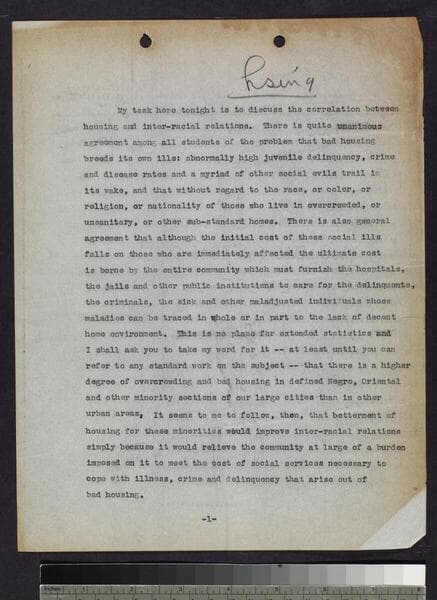 Untitled, incomplete speech by Loren Miller beginning "My task here tonight"